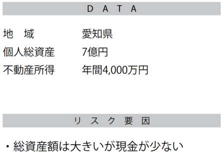Jさんの総資産は7億円。そのうちの1億円だけが現金として手元にあります。不動産収入は年間8000万円で経費としてかかるのは4000万円なので、不動産所得は4000万円でした。