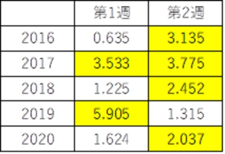 週間値幅が2円以上に拡大するということは、そのレンジをブレークする可能性があるわけです。