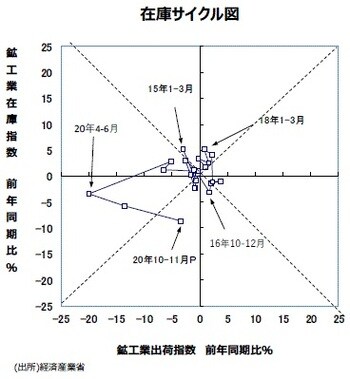 ●大きな動きをチェックするために、鉱工業全体で縦軸に在庫の前年比を、横軸に出荷の前年比をとった在庫サイクル図をつくると、17年10~12月期以降、45度線を上回って推移し、概ね「在庫積み上がり局面」が続いていた。19年10~12月期、出荷の前年同期比が▲6.5%、在庫が同+1.2%、20年1~3月期、出荷の前年同期比が▲5.2%、在庫が同+2.9%と、どちらも「在庫調整局面」であった。20年4~6月期は、出荷の前年同月比が▲19.9%、在庫が同▲3.4%と、出荷は大幅に減少したものの在庫調整がさらに進んだ。20年7~9月期は、出荷の前年同期比が▲13.5%、在庫が同▲5.7%と、引き続き「在庫調整局面」の状態にあったが、10~11月分速報値では出荷の前年同月比が▲3.4%、在庫が同▲8.7%と在庫調整が進んで「意図せざる在庫減局面」に入った。