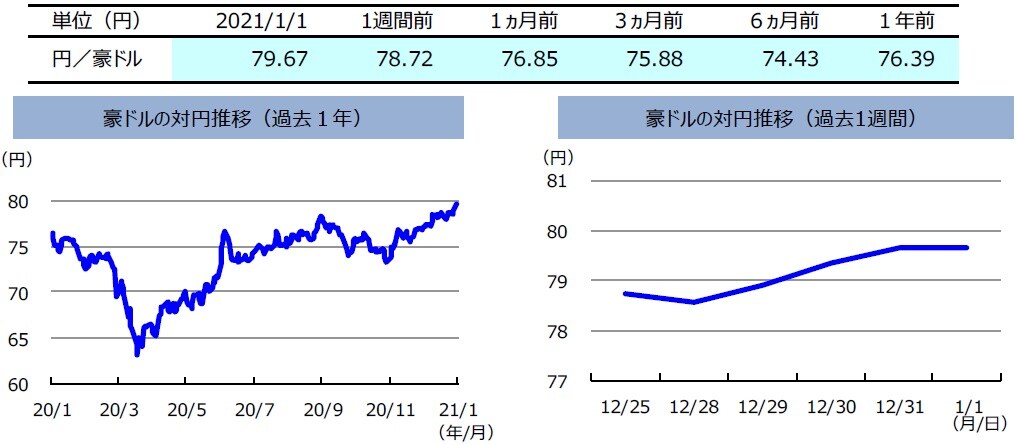 先週の豪ドルの対円レートは、上昇しました。新型コロナ変異種への懸念が依然燻り、豪州ではビクトリア州における感染確認を受けた規制強化が表明される中、米国の追加景気対策案の成立や、英国とEU間の自由貿易協定の合意などを背景としたリスク選好的な動きにより、景気に敏感な資源国通貨である豪ドルが買われる展開となりました。週間を通して豪ドルの対円レートは上昇しました。
