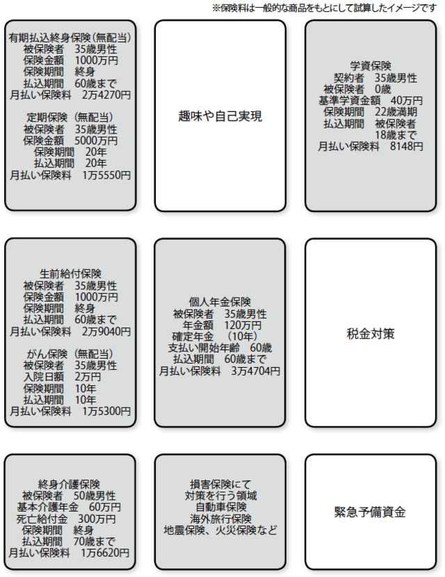 それ以外のマス――年金や将来の夢のお金まで保険で蓄えようとして、貯蓄効果の高い保険を選ぶ必然性はありません。そうすると、保険料負担はどんどん高額になってしまいます。