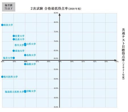 また、偏差値75以下のグループを集めたグラフの共通テストの目標得点率の低い大学でも、例えば秋田大学は、2次試験で最低80%以上の得点率が必要です。いわゆる難問はほとんど出題されません。逆に宮崎大学は45%が合格ラインになっており、出題難度が高くなっています。