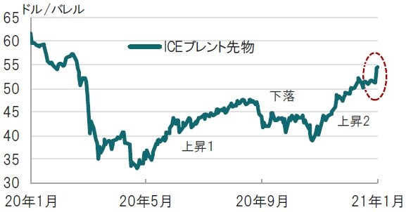 まず、原油市場の動向について新型コロナウイルスの影響などで急落した昨年春以降を振り返ります(図表1参照)。