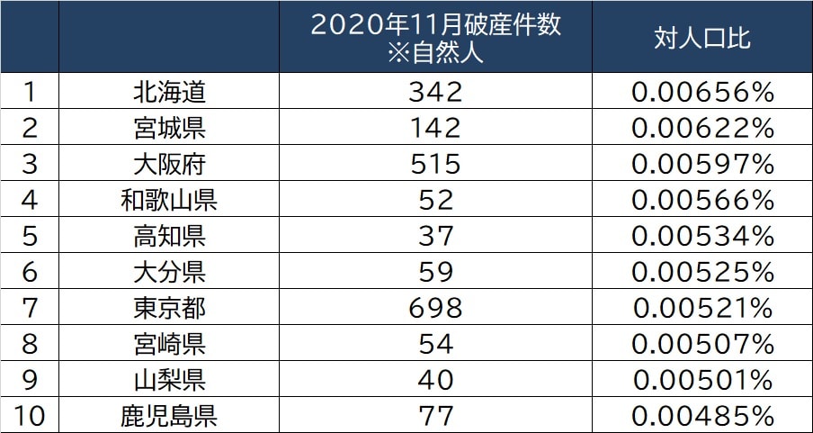2020年11月の破産事件件数をもう少し細かくみていきます。都道府県別(裁判所管内別)でみると、自己破産件数(自然人)が最も多いのが「東京都」で698件。「大阪府」「神奈川県」「北海道」「埼玉県」と続きます。やはり人口の多い地域だと、自己破産件数も多くなっています。