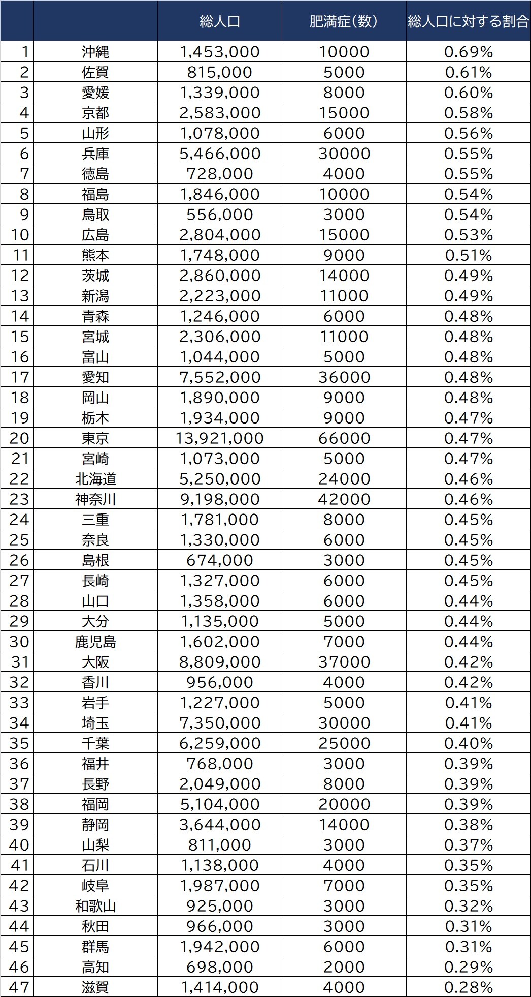 都道府県「肥満症(対人口比)」ランキング1~47位