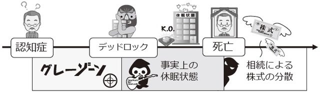 株主の判断能力喪失が原因となって、デッドロックに陥った会社は、デッドロックから解放されたときに、株式が分散してしまうことがあります。