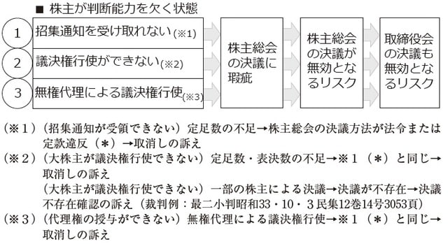 株主が認知症になり、判断能力を失うと、株主総会の決議が無効になるリスクがあるだけでなく、場合によっては、取締役会の決議まで無効になるリスクがあります。