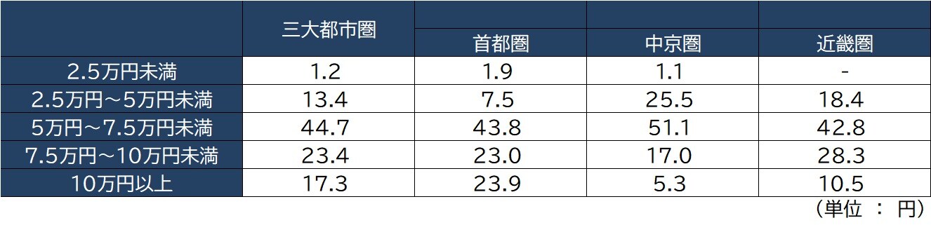 賃貸派のお金まわりをみていきましょう。月額家賃の平均は7万5306円。「5万~7.5万円」が最も多く44.7%、「7.5万~10万円未満」が23.4%、「10万円以上」が17.3%。一方、購入派の1ヵ月当たりのローン返済額は10.3万円となっています(図表3)。
