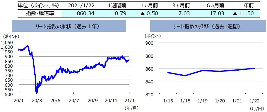 先週の豪州リート指数は、上昇しました。米国追加経済対策への期待感などを背景に欧米株式市場が概ね上昇したことを受けてグローバル・リート指数は上昇しました。豪州リート指数も、豪州株式市場の上昇などを受け上昇して終えました。