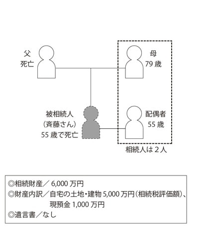 斉藤さんの父親は25年も前に母親と離婚し、その後、独身を通しましたが、5年前に他界しました。母親は再婚後、音信不通で斉藤さん夫婦との付き合いはまったくありません。夫婦は自宅のほかに少々の蓄えがありましたが、評価額にすると自宅の土地・建物5000万円、預貯金1000万円で相続税の心配はそれほどありません。