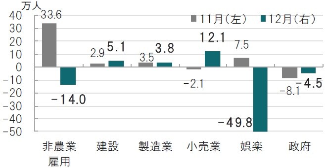 まず、短期的な経済活動や雇用の動向ついては、声明文で前回の回復は「続いている」が「緩やかになった」に置きかえられており、当面のペースの鈍化を指摘しています。特に懸念しているのは会見でもパウエル議長が具体的なセクターを口にしていた娯楽部門で、20年12月の雇用統計にも明確に示されています(図表2参照)。