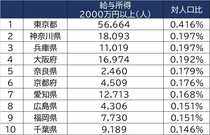 都道府県別に給与所得2000万円以上の分布を見てみると、最も多いのが「東京都」で5万6664人。「神奈川県」1万8093人、「大阪府」1万6974人、「愛知県」1万2713人、「兵庫県」1万1019人と続きます。