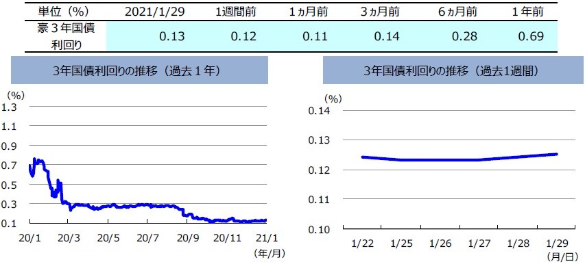 先週の豪州3年国債利回りは、若干上昇しました。米国株式市場の下落などを背景としたリスク回避的な動きも見られましたが、豪州ではCPIの上振れを受けて豪州準備銀行(RBA)による金融緩和の是正観測が高まり、豪州3年国債利回りは若干上昇(国債価格は下落)しました。