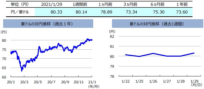 先週の豪ドルの対円レートは、若干上昇しました。米国株式市場が投機的な動きなどを背景に下落したことや、ワクチン供給不安からリスク回避姿勢が強まり、景気に敏感な資源国通貨である豪ドルは売られやすい展開となりました。しかし、堅調な経済統計が公表されたことなどを背景に豪州の景気回復期待が高まった結果、週間を通しては豪ドルの対円レートは若干の上昇となりました。