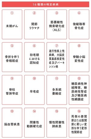 40歳から保険料は支払っているのですが、実際に介護保険サービスを利用できるのは、65歳以上の介護や支援が必要になった人です。この年齢ならば介護が必要となった原因は問われません。40歳以上64歳までの人は、医療保険加入者であること、16種類の特定疾病が原因で介護や支援が必要な状態になるという条件があります。例えば、62歳で交通事故が原因で介護が必要となっても介護保険は利用できないのです。