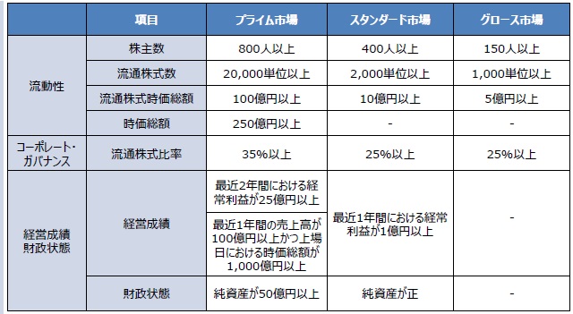 まず、第二次制度改正事項では、現行の「市場第一部」、「市場第二部」、「マザーズ」、「ジャスダック」の4市場区分が、「プライム」、「スタンダード」、「グロース」の3市場区分へ移行する時期は、2022年4月4日であることが明示されました。また、上場にあたっての厳格な審査基準を設け(図表1)、市場で実際に売買できる「流通株式」を重視する観点から、流通株式の定義を見直す方針が示されました。