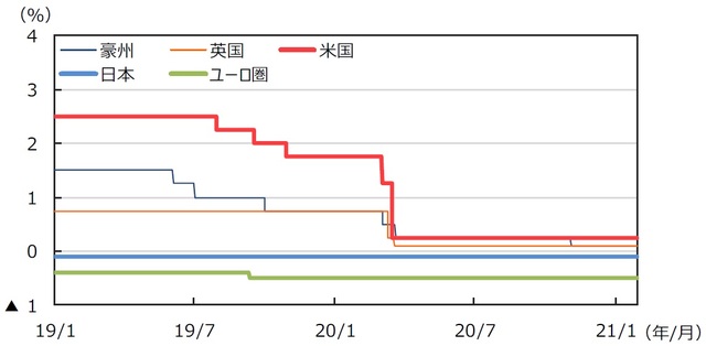 中国の2020年10-12月期の実質GDP成長率は、前年同期比+6.5%となり市場予想を上回りました。新型コロナ感染への懸念が後退したため消費が明確に持ち直しました。共産党指導部は、景気は回復し正常化したとの認識を示しました。豪州の2020年7-9月期の実質GDP成長率は前年同期比▲3.8%となり、輸出や消費(除くビクトリア州)が大幅に回復しました。