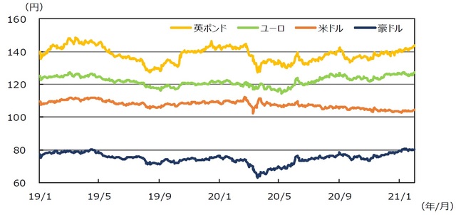 円は円安傾向となりました。米民主党の「トリプルブルー」が実現したことで、追加経済対策期待から米国株式市場では株価が史上最高値を更新し、長期金利が上昇したことを受けて米ドルが上昇しました。円は対米ドルで月初の103円台から104円台に下落しました。円は対ユーロでも下落しました。ユーロはユーロ圏で新型コロナ変異株などの感染拡大による景気減速懸念が強まったことやイタリアの政局不安などから対米ドルでは下落しました。円は対豪ドルで若干下落しました。豪ドルは中国の景気回復や商品価格の上昇などを背景に上昇した後、米長期金利の上昇を受けて上値の重い展開となりました。