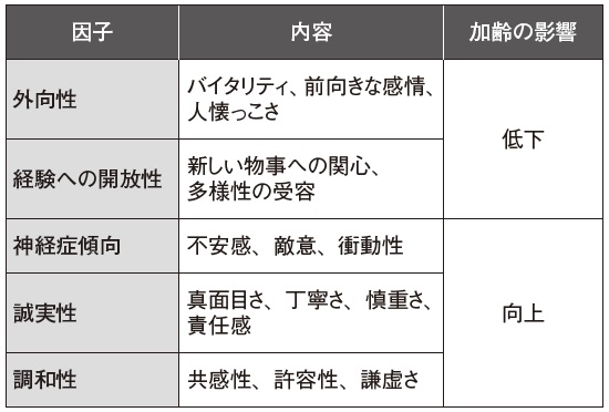 心の高齢化だけではなく、加齢に伴って個々人の性格も次第に変化していきます。図表1をご覧ください。人間の性格を心理学的に分析する際の5つの因子(いわゆるビッグファイブ理論)として、「外向性」「経験への開放性」「神経症傾向」「誠実性」「調和性」がしばしば用いられます。