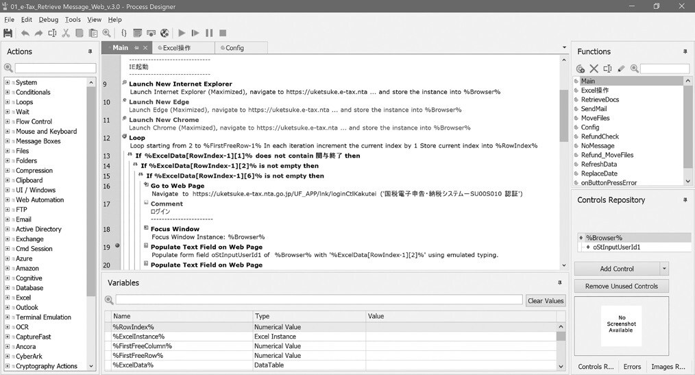 プロセス・デザイナーのメインエリア(図表3)には設定したアクションが表示されるので、どのような操作が行われるかは、それを見れば分かります。アクションをダブルクリックすれば設定画面が開き、細かく設定できます。