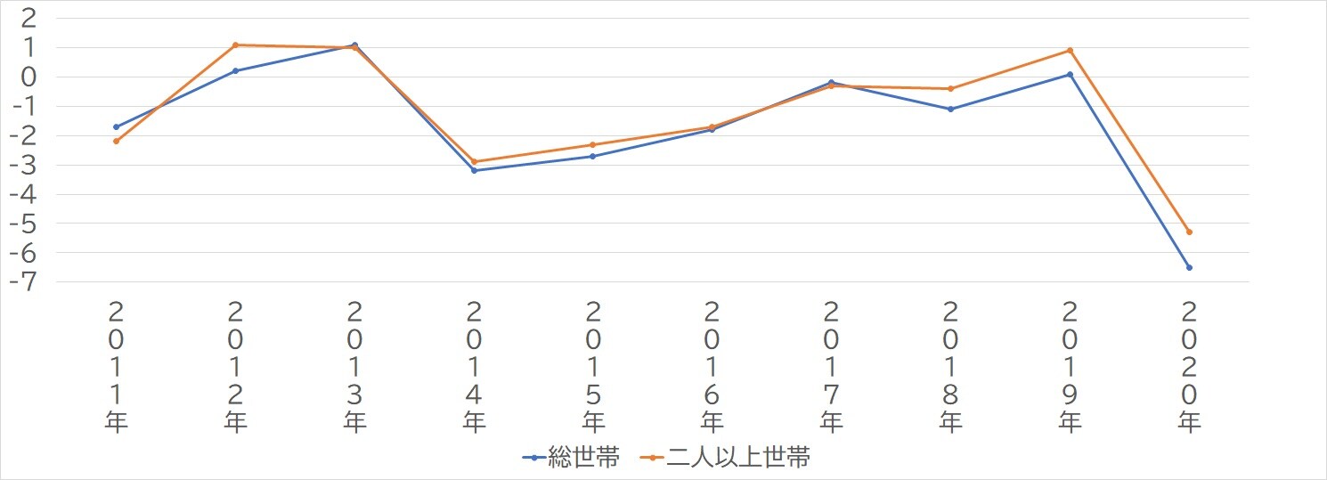 2011年からの10年の推移でみてみると、総世帯でマイナスを記録したのは、2011年1.7%減、2014年3.2%減、2015年2.7%減、2016年1.8%減、2017年0.2%減、2018年1.1%減と、決して減少することは珍しいことではありませんが、減少幅としては過去10年で最大となっています(図表1)。