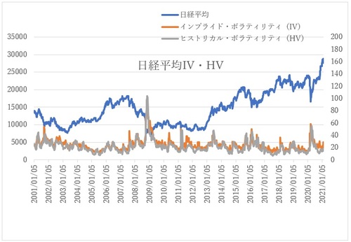 ②インプライド・ボラティリティ:実際に売買されているオプション価格から求めるもの。
