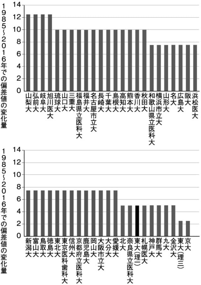 偏差値が上昇したのは山梨大学、弘前大学、岐阜大学、旭川医科大学(12.5)、琉球大学、三重大学、福島県立医科大学、福井大学、名古屋市立大学、長崎大学、千葉大学、島根大学、高知大学、熊本大学、香川大学、秋田大学(10)と続きます。