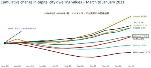 2020年3月新型コロナ発生時を起点(ゼロ)として、2021年1月までの価格の推移が表示されています。ご覧の通り、先ほど記述した政府の新型コロナ対応策が施行された時期の2020年4月、5月、6月、7月は全体的に価格が下落しました。しかし、感染の拡大の抑制、そして国による刺激策の効果が出始めた8月ごろから徐々に価格が上昇し、結果的にシドニーとメルボルンを除く全ての都市で価格上昇しました。