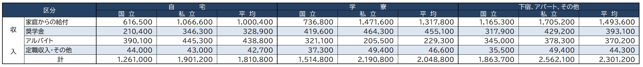 大学生活にかかるのは、当然、学費だけではありません。前出の『学生生活調査』で居住形態別の生活費を見てみると、自宅居住の場合、国立大学の学生で112万2300円、私立大学の学生で181万800円。アパート等に居住の場合、国立大学の学生で176万5800円、私立大学の学生で249万5300円。