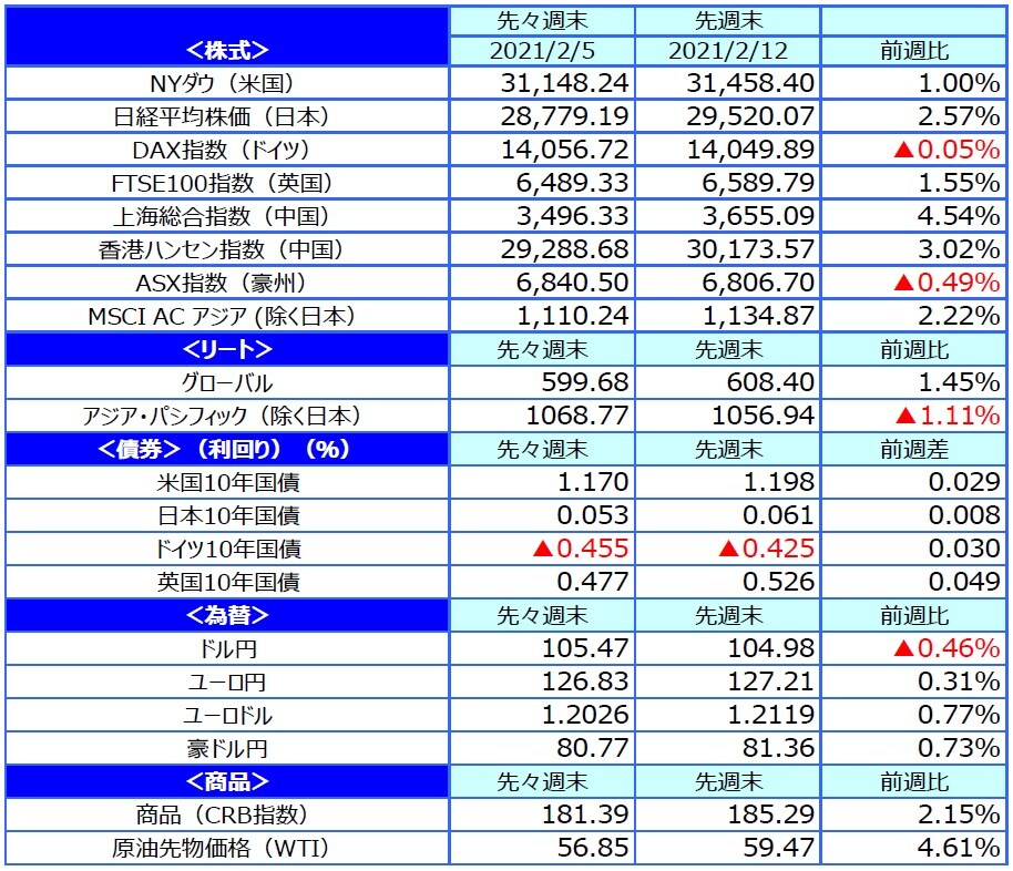 (注5)前週比は2021年2月5日から2021年2月12日まで、前月末比は2021年1月29日から2021年2月12日まで、前年末比は2020年末から2021年2月12日まで。