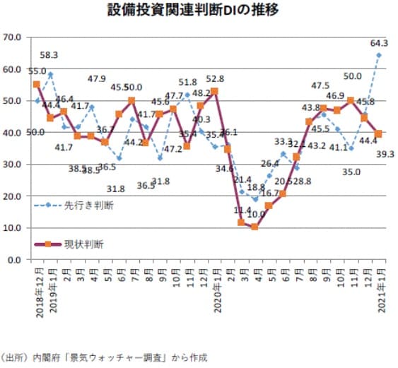 ●景気ウォッチャー調査の設備投資関連・DIの20~21年の動きをみよう。20年1月の現状判断DIが52.8(同9人)と18年12月分の55.0以来の50超となった。当時の設備投資関連・現状判断DIからは底堅さが感じ取れるようになってきていた。しかし、新型コロナウイルスの影響で現状判断DIは4月10.0(同5人)へと急落した。4月を底にその後、緊急事態宣言解除もあり、多少の上下はあったものの11月は50.0(同13人)まで持ち直した。その後新型コロナウイルス感染再拡大の中、12月は44.4(同9人)、1月は39.3(同7人)と低下している。1月のコメントには「新型コロナウイルスの第3波のため、客先業界全体も厳しくなってきた。取引先も設備投資をほとんどしないということになり、2月分等のキャンセルがたくさん入り、非常に難しい状況である」(東海、電気機械器具製造業〔経営者〕)とコロナ禍で設備投資が出ていないことを指摘するものがあった。