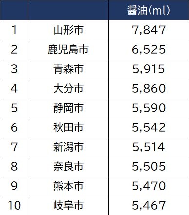 続いて「醤油の購入量」。全国平均は4979mlに対して、最も多いのが「山形市」で7847ml。全国平均の1.6倍ほどです。「青森市」は3位、「秋田市」は6位、「盛岡市」は19位です(図表4)。