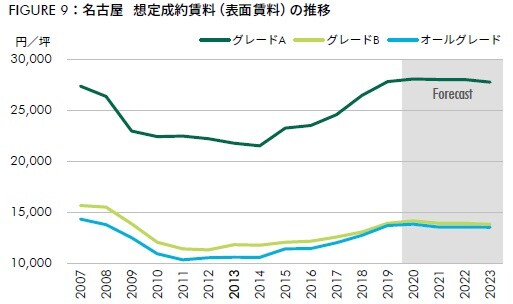 以上のことから、グレードAの空室率は2023年Q4時点で3.8%と、対2020年Q4比で2.6ポイント上昇、賃料は緩やかな下落傾向となり同-1.1%の27,750円/坪を予想する(FIGURE9)。
