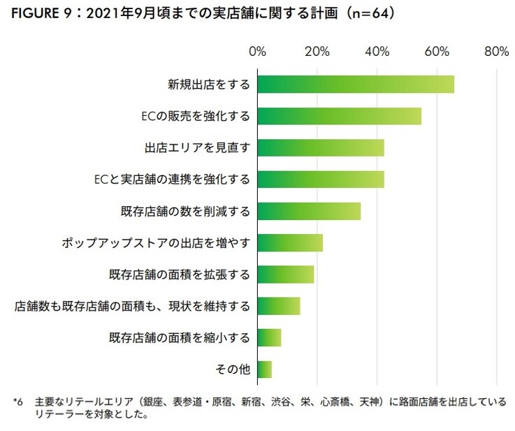 CBREが2020年10月に行ったテナントアンケート*6では、リテーラーの出店意欲が感じられている(FIGURE9)。今後、12ヵ月の実店舗に関する計画について訊いたところ、65.6%が「新規出店をする」と回答、最も高い割合となった。多くのリテーラーが、マーケットや物件の調査を行いながら、ブランド戦略に合った出店機会をうかがっていることが示唆される。