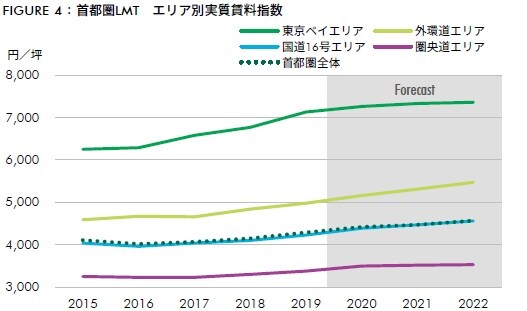 空室率1%未満というタイトな需給環境を受け、首都圏全体の実質賃料は2020年一年間で3%程度の上昇となる見込み。大量供給を控えて今後の賃料上昇率は若干抑制されるとみられる。