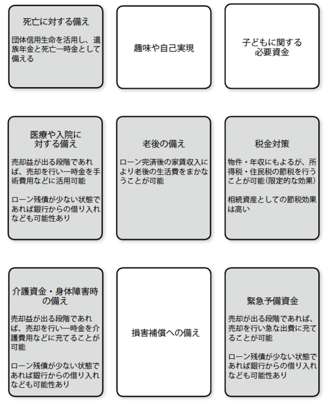 不動産は、マネーパズルのオールラウンドプレイヤーともいうべき存在です。保険と違って、1つの商品で複数のマスを埋めることができるからです。
