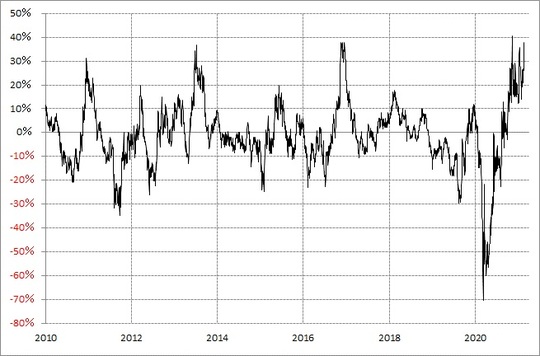 確かに、米10年債利回りに対するNYダウ益回りは、昨年3月の世界的な株大暴落、コロナ・ショック後に10倍以上にも急上昇しましたが、足元では2倍程度まで低下してきました(図表2参照)。債券に対する株の優位性が大きく後退し、コロナ・ショック以前の数値まで戻ってきました。