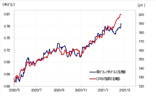 これは、原油相場などの資源価格、そしてコモディティー相場全般の上昇が続いた影響が大きかったと考えられます。代表的な資源国通貨とされるだけあって、豪ドルはコモディティーの総合的なインデックスであるCRB指数と高い相関関係があるのです。