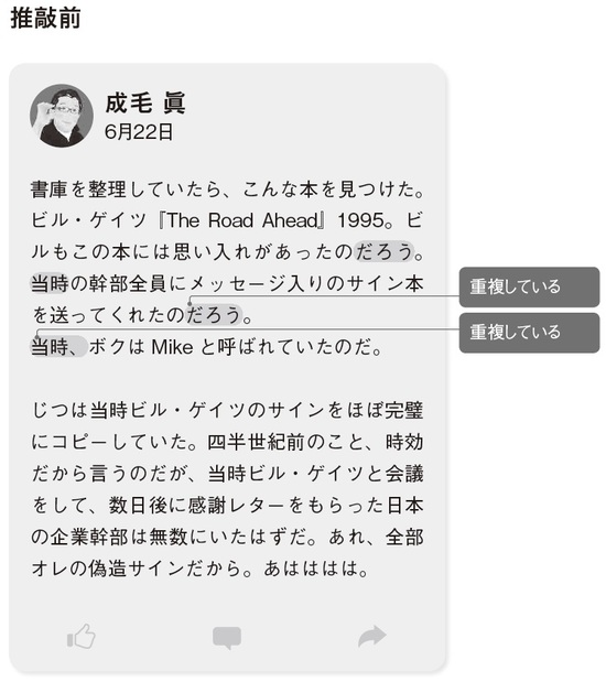 それでも修正したのは、何より自分自身が読んで気持ち悪さを感じたからである。同じ言葉を続けて使った場合も同様だ(図表2)。