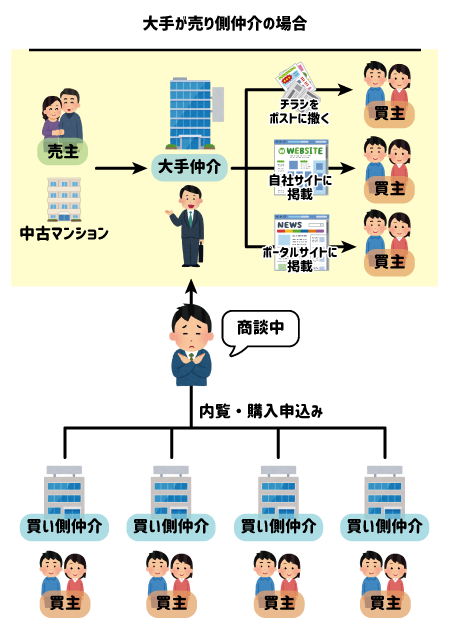 まずは、不動産の売買取引時には売り側と買い側の仲介会社が登場しますが、売り側の仲介会社がする売却活動を図で解説します。