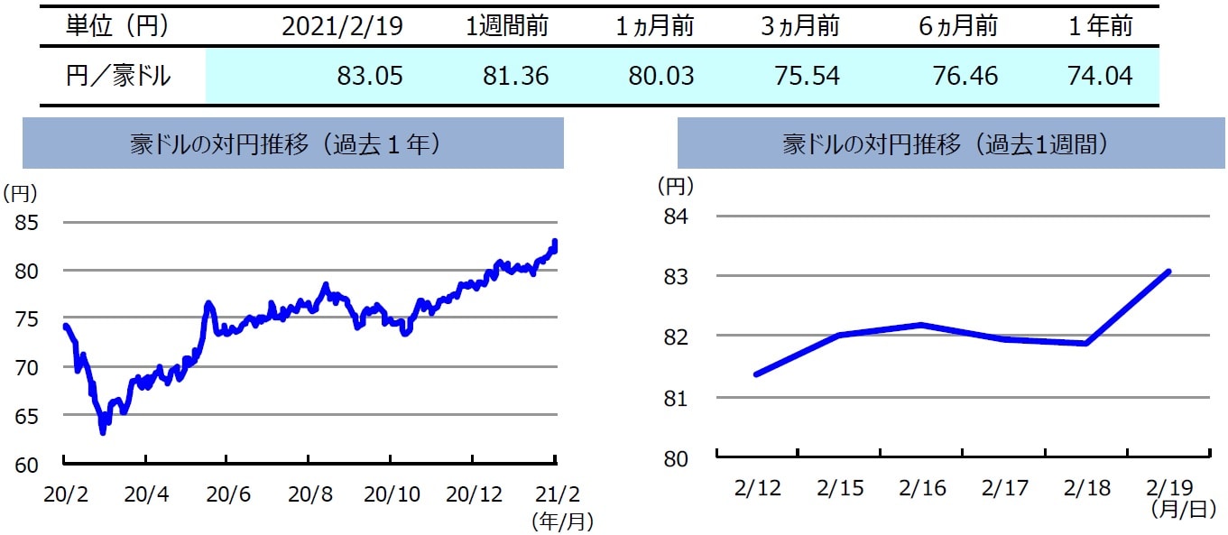 先週の豪ドルの対円レートは、大幅に上昇しました。米国の経済対策法案の進捗や、新型コロナワクチン普及による経済回復への期待感などを背景にリスク選好的な動きとなり、景気に敏感な資源国通貨である豪ドルが買われやすい展開となりました。豪雇用統計の堅調な結果も豪ドルの買い材料となり、週間を通して豪ドルの対円レートは大幅に上昇しました。
