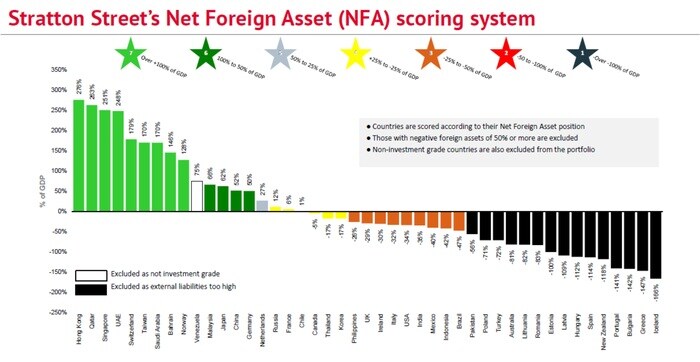 そして、下記図にあるように対外純資産残高に応じて、1から7のスコアをつけます。スコア7は対外純資産残高がGDPより大きいことを指し、スコア6は対外純資産残高がGDPと同等(100%)から50%。スコア2は対外債務がGDPの50%を超えている国で、スコア1はGDP以上の対外債務を抱える国となっています。そして、スコア1と2となった国を投資対象から除きます。この時点で、投資対象となる国は、65から47へと絞られます。