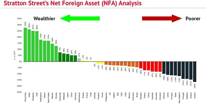 アンディ 最初のプロセスはレバレッジ解消のサイクルであるかどうかということを確認すること。そして、どの国が債権国なのか確定することです。下記図に国別に対外純資産残高のランキングを示しています。
