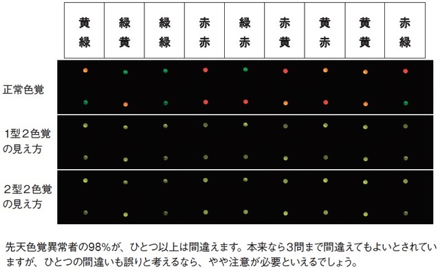 「小学校の時の検査で色覚異常といわれたけれど、シャツやネクタイの色、ノートや伝票の色も、間違えたことはない。だから自分の色覚は正常であって、検査の方が間違っていたのだろう」と考える人がいます。もちろん検査が正しく行われたことが前提となりますが、このような軽度といえる色覚異常の人であっても、やはり条件によっては色を間違えることがあるので注意が必要です。