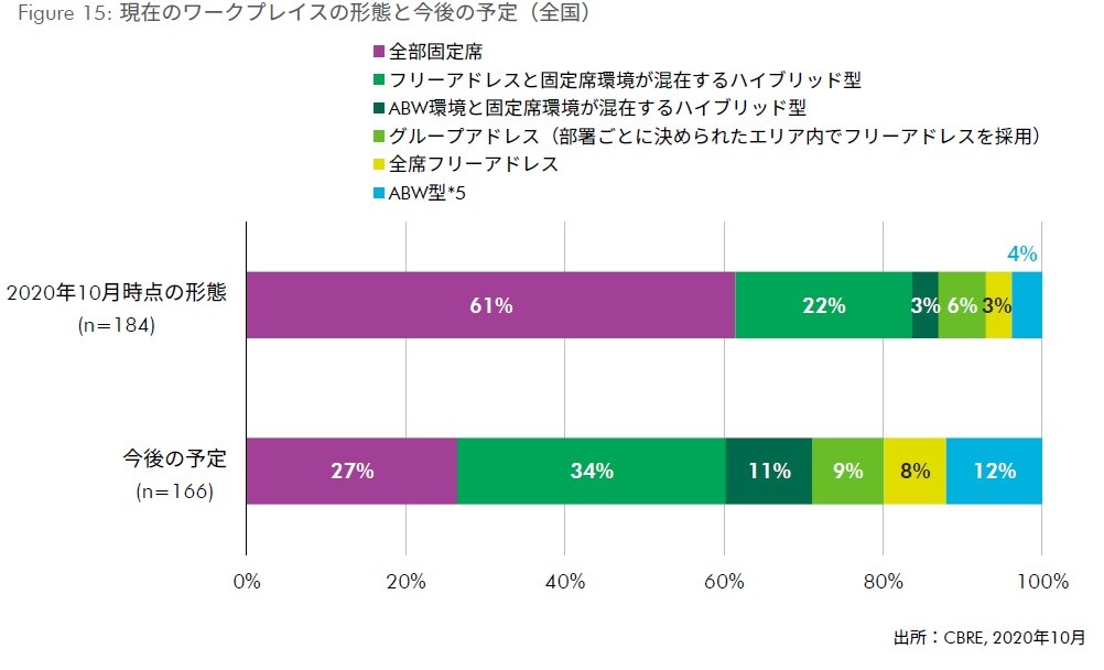 調査時点では「全部固定席」が全体の61%を占めているが、今後の予定では全体の27%に減少している(Figure15)。多くの企業が、よりフレキシブルなワークプレイスへの移行を志向しているようだ。