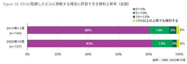 一方で、ESGに配慮したビルに移転する場合にテナントが許容・検討できる賃料上昇率は、2019年の前回調査から大きな差は見られなかった(Figure18)。