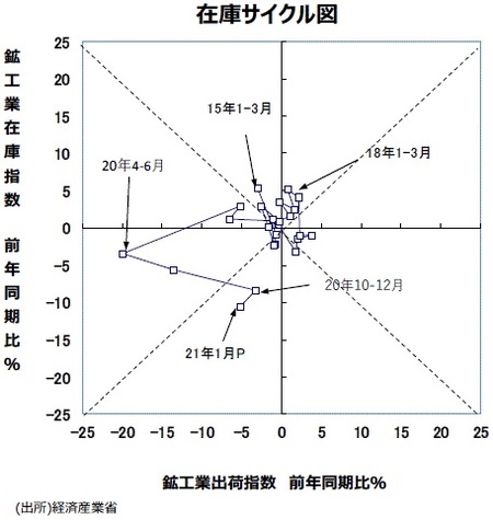 ●大きな動きをチェックするために、鉱工業全体で縦軸に在庫の前年比を、横軸に出荷の前年比をとった在庫サイクル図をつくると、17年10~12月期以降、45度線を上回って推移し、概ね「在庫積み上がり局面」が続いていた。19年10~12月期、出荷の前年同期比が▲6.5%、在庫が同+1.2%、20年1~3月期、出荷の前年同期比が▲5.2%、在庫が同+2.9%と、どちらも「在庫調整局面」であった。20年4~6月期は、出荷の前年同月比が▲19.9%、在庫が同▲3.4%と、出荷は大幅に減少したものの在庫調整がさらに進んだ。20年7~9月期は、出荷の前年同期比が▲13.5%、在庫が同▲5.7%と、引き続き「在庫調整局面」の状態にあったが、10~12月分では出荷の前年同月比が▲3.3%、在庫が同▲8.4%、そして21年1月分では出荷の前年同月比が▲5.1%、在庫が同▲10.5%と、20年4~6月期以降在庫が減少する中で、在庫調整がかなり進んで「意図せざる在庫減局面」になっている。
