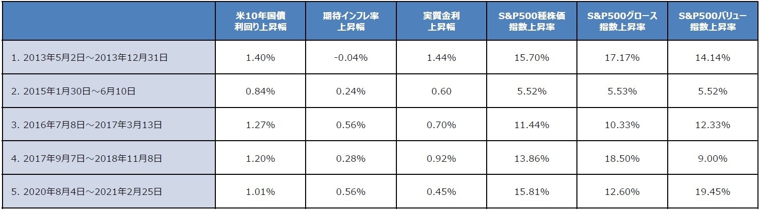 5回目は2020年8月から2021年2月までの期間です。この期間、米10年国債利回りは1.0%上昇しましたが、S&P500指数も15.8%上昇し、バリュー指数が好調でした。以上、過去5回の長期金利の上昇局面を検証したところ、株価は下落しても一時的で、より長い期間では、上昇する傾向が確認できました。また、長期金利の上昇は、必ずしもバリュー株に優位に働くとは限らないことも明らかになりました。