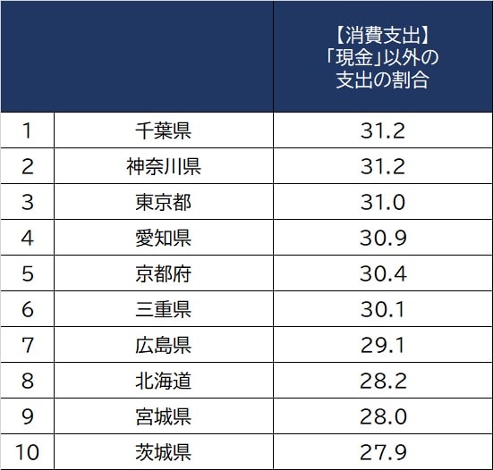 それによると、最もキャッシュレスが進んでいるのは「千葉県」で消費支出全体に対して31.2%。続いて僅差で「神奈川県」。「東京都」「愛知県」「京都府」と続きます。一方で最もキャッシュレスが進んでいないのが「鹿児島県」14.9%。「長崎県」「佐賀県」「宮崎県」「大分県」と続きます(図表1)。