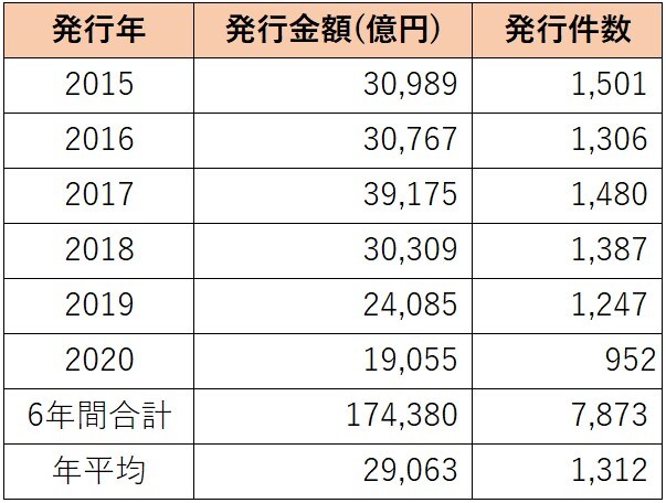 [図表1]の通りに推移しており、年間で平均的に約2.9兆円発行され、約1,300件取引されており、1件あたりの平均発行金額は20億円程度となっている。